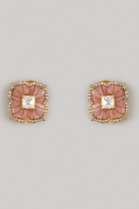 Pink floral shaped stud earrings featuring moissanite polki and cubic zirconia embellishments