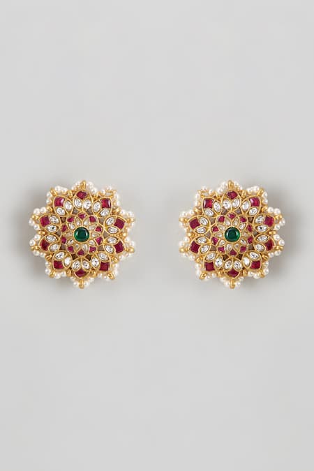 Red floral stud earrings crafted from 925 silver featuring intricate Kundan stones and pearl embellishments