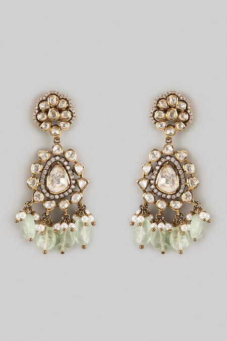 Gold and green Victorian danglers featuring moissanite polki, cubic zirconia, and semi-precious bead embellishments