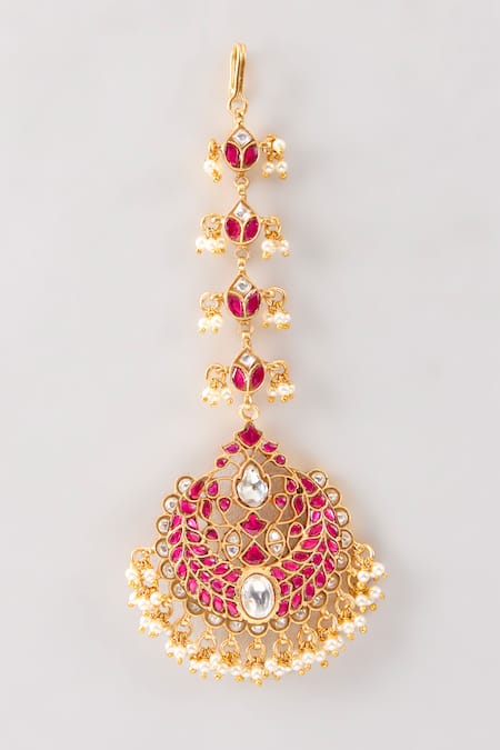 Red maangtikka handcrafted with stones, beads, and kundan stones