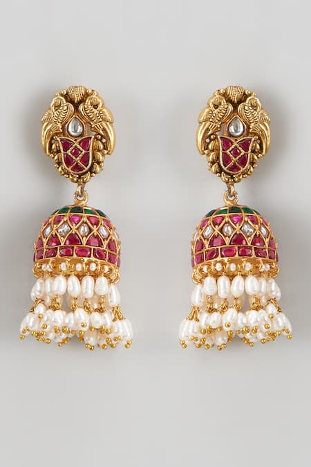 Carved parrot motifs, Pearl tassels detail, Kundan stone embellishments