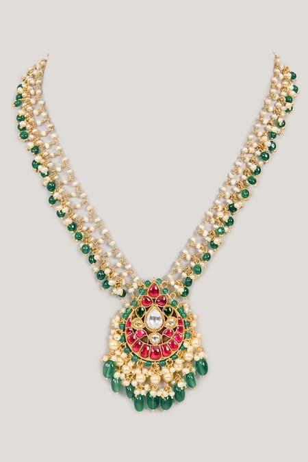 Green kundan stone embellished pendant necklace featuring a tear drop shape and pearl, semi-precious bead drops. Handcrafted in 925 silver with an adjustable link closure.
