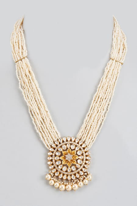 White Moissanite Polki And Pearl Embellished Pendant Necklace