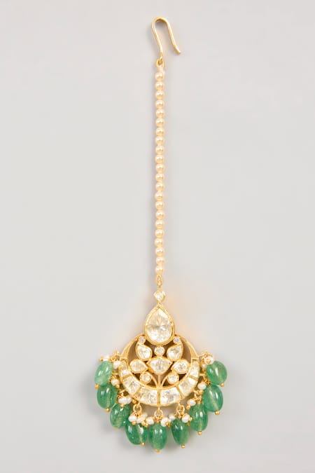 Green maangtikka featuring moissanite, polki, semi-precious beads, and pearls. Handcrafted in 925 silver with 22kt gold plating.