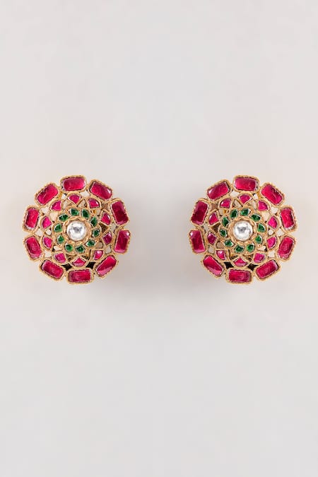 Red Phool Kundan earrings crafted from 925 silver featuring intricate stones and beads work