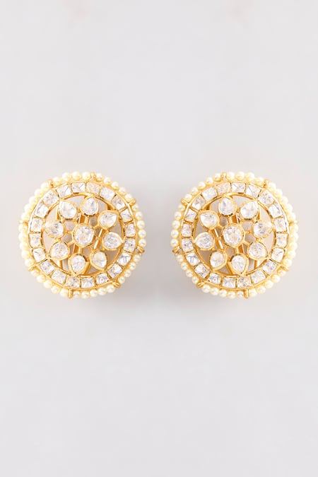 Moissanite polkis set in a circular pattern, Surrounded by a pearl bead embellishment, Handcrafted detailing with nickel-free material