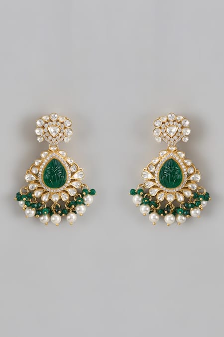 925 silver & 22kt gold-plated drop pattern earrings embellished by moissanite polkis, semi precious beads, carved center stone, pearls & cubic zirconia.