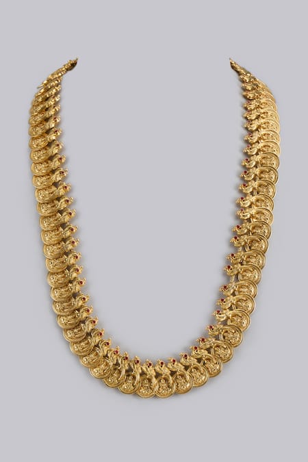 Gold plated necklace featuring Goddess Laxmi coin carvings and an adjustable dori closure