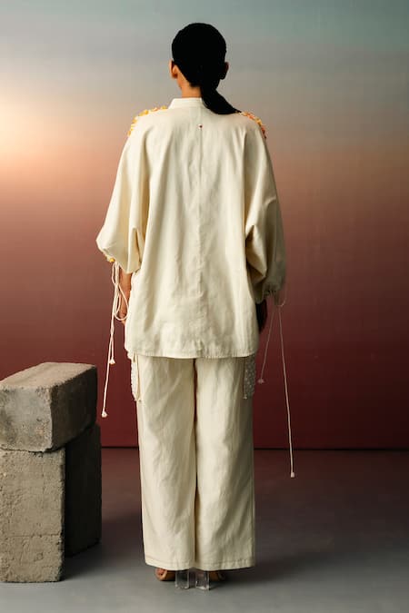 Buy_Karishma Kajaria_Beige Cotton Beads Collared Tassel Embroidered Shirt _Online_at_Aza_Fashions