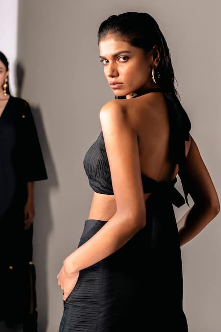 Buy_Karishma Kajaria_Black Hemp, Cotton Halter Neck Pleated Bustier _Online_at_Aza_Fashions