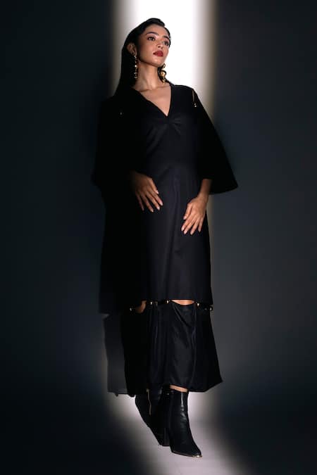Black Silk, Cotton Round Neck Solid Straight Midi Dress