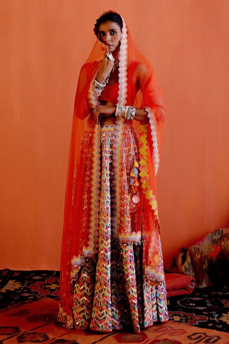 Orange sheer dupatta featuring multicolor thread, bead, and mirror tassel embroidered cutwork border