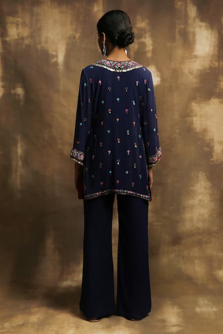 Navy blue short kurta with geometric embroidered motifs & metal sequin tassel. Paired with pant & geometric embroidered tabby silk scarf.