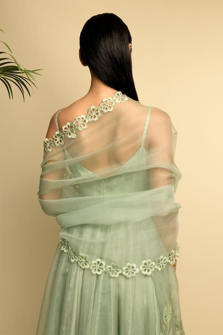 Green anarkali with floral embroidery hand cut & highlighted with Swarovski crystals. Paired with churidar & embroidered organza dupatta.