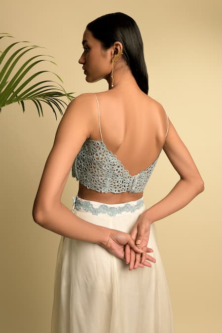 Off white skirt with blue embroidery in floral hand cut with highlights of Swarovski crystals. Paired with blue embroidered blouse hand cut & highlighted with Swarovski crystals.