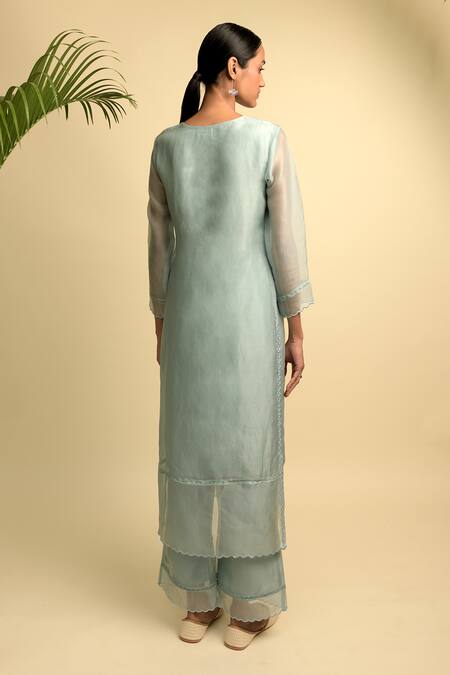Grey blue kurta with scallop border & front buttons. Paired with organza pant & dupatta embroidered, highlighted with Swarovski crystals