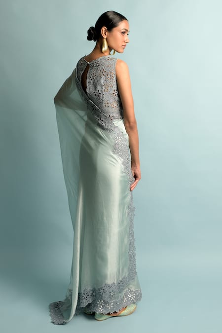 Grey blue saree with hand cut floral embroidery highlighted with Swarovski crystals. Paired with embroidered sleeveless blouse.