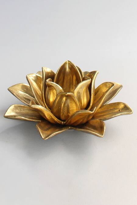 Gold-tone resin votive in 3D lotus motif design & carved detail.