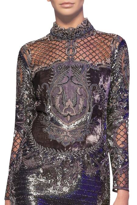 Grey Tulle Net High Neck Embroidered Dress