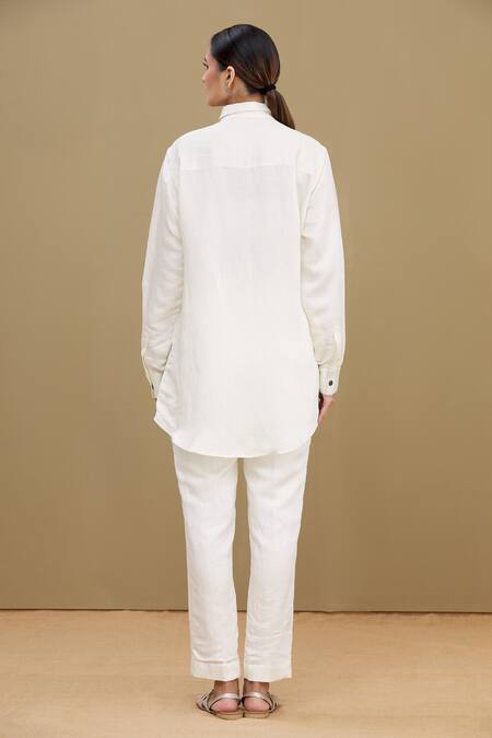 White Linen Satin Blend Collared Neck Embroidered Shirt