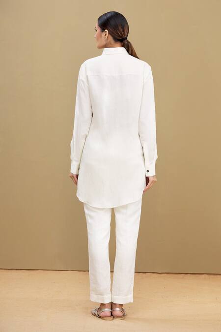 White Linen Satin Blend Collared Neck Embroidered Shirt