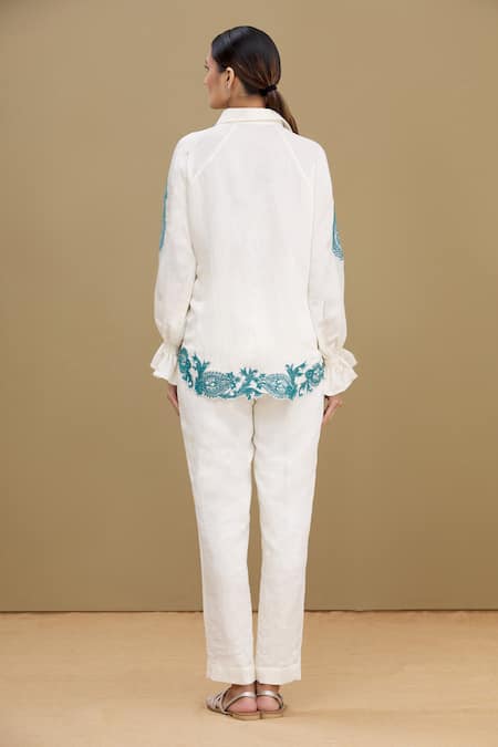 Ivory shirt with turquoise floral embroidery, monogrammed buttons and frill hem sleeves.