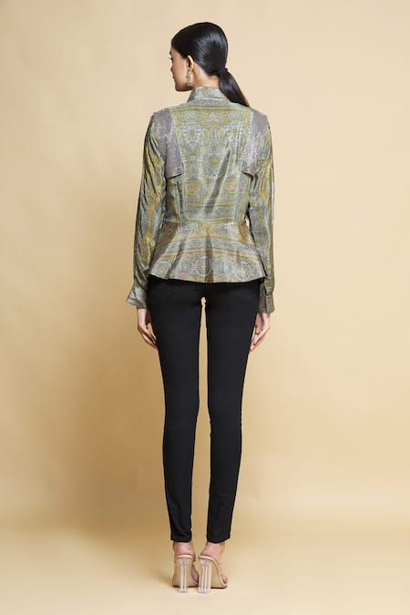 Yellow silk crepe peplum top with all over printed motifs.