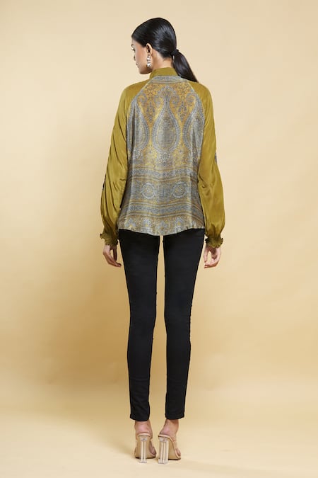 Mustard yellow silk crepe shirt with all over printed motifs.