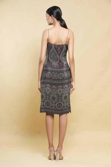 Maroon silk georgette dress with all over printed motifs and side slits detail.