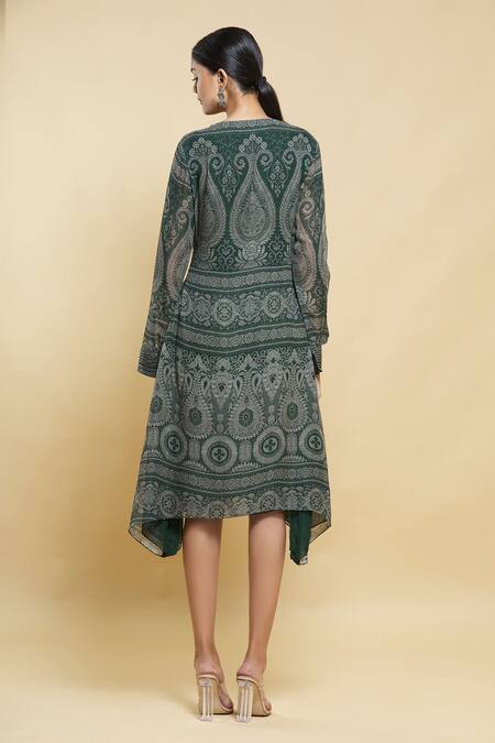 Green silk georgette tunic with all over printed motifs and asymmetric hem.