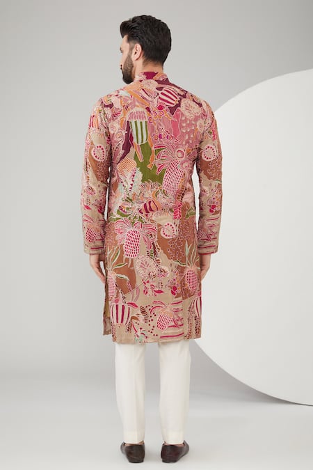 Multi-colored slub silk kurta featuring abstract zari embroidery and a mandarin collar. Paired with matching pants to complete the set.