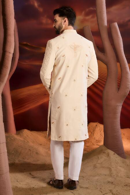 Intricate floral embroidery on the front and back, Detailed patterns on the sleeves, Front zip closure for a modern touch