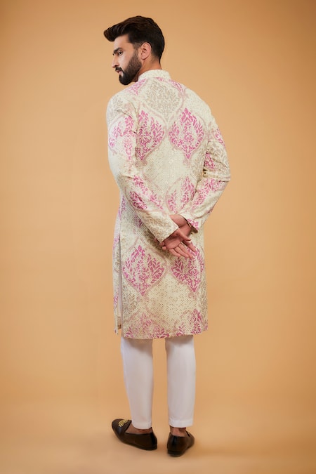 Multicolor chikankari kurta featuring thread and sequin embroidery on a printed base