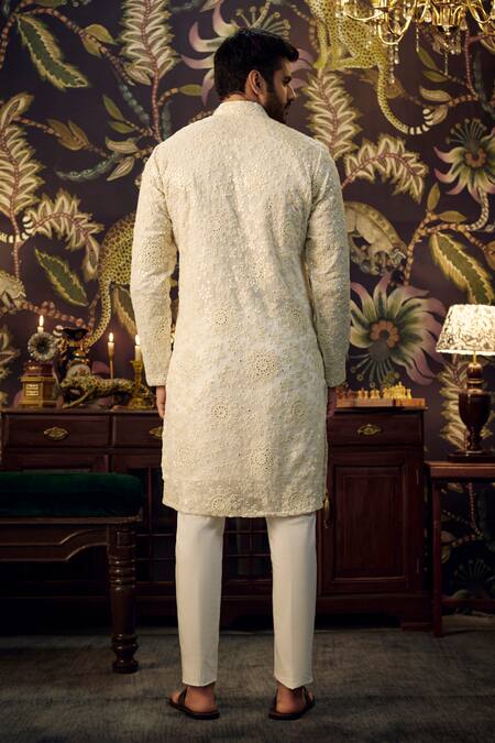 White kurta featuring intricate chikankari embroidery with mirror work