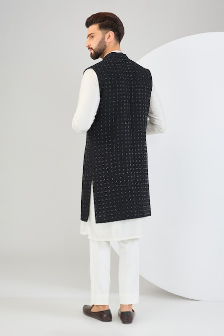 Black open shrug featuring tonal cutdana and thread embroidered checkered motifs