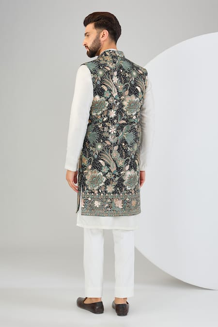 Leather patchwork flora and fauna motifs, Thread-sequin embroidery detailing