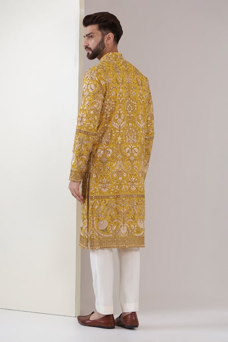 Yellow georgette kurta featuring a mandarin collar and full sleeves with an all-over floral vintage jaal pattern. Paired with white straight fit pants, the kurta showcases intricate resham, zari, and sequin embroidery along with contrast border details and side slits.