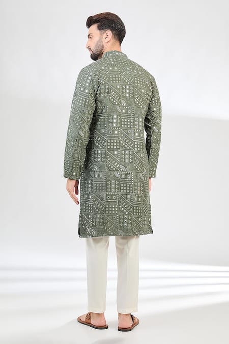 Military green kurta featuring mirror work embroidery in a geometric pattern
