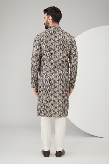 Black and grey georgette kurta featuring geometric print and sequins embroidery. Paired with matching pant for a complete look.