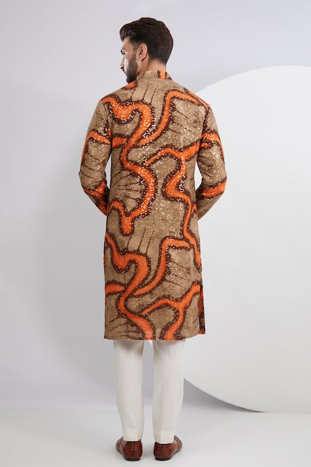 Green and orange kurta featuring thread embroidered jaal patterns with sequin embellishments. Paired with a matching pant.