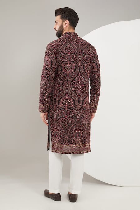 Paisley and floral embroidery with sequins, Kashmiri thread detailing, Mandarin collar design