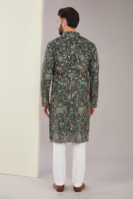 Animal and forest motifs embroidery, Mandarin collar design, Full sleeves with intricate detailing