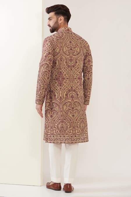 All over Kashmiri Jamawar pattern, Contrast thread & sequin embroidery, Side slits on kurta