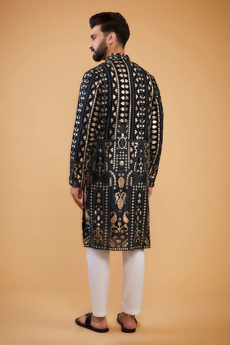 Black kurta featuring leather patchwork in geometric pattern
