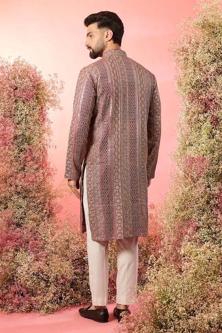 Maroon and green zari kurta featuring intricate patterns and a stand collar