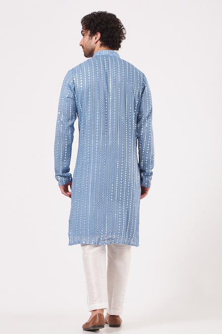 Blue kurta in georgette featuring foil and mirror hand embroidery. Paired with a pant for a complete look.