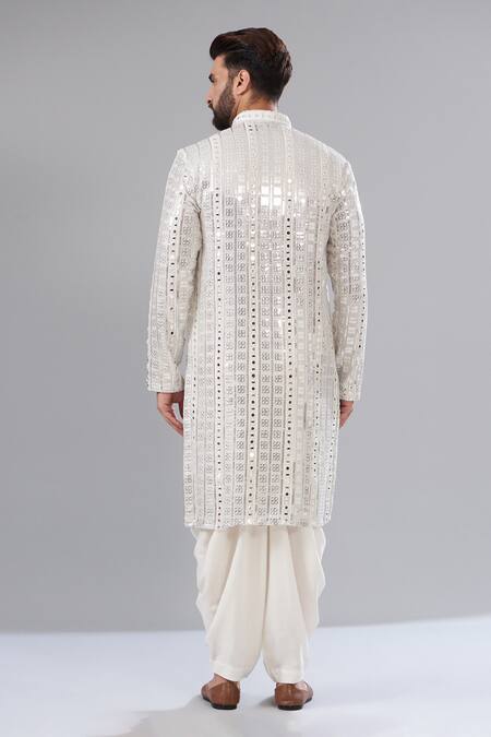 White kurta featuring silver mirror and sequin embroidery with a mandarin collar and sleeveless design