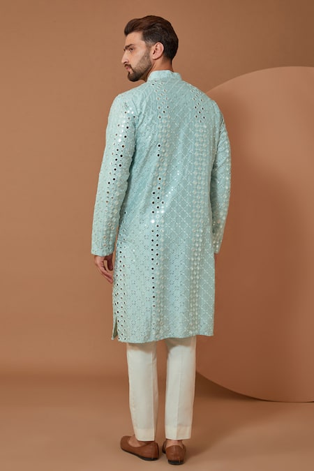 Sky blue silk kurta featuring intricate thread and mirror embroidery. Paired with matching pants for a complete look.