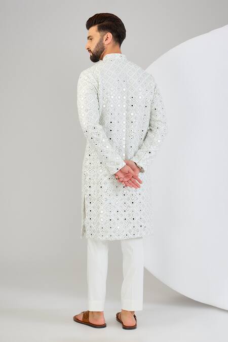 Geometric mirror embroidery throughout the kurta, Thread detailing enhancing the geometric patterns