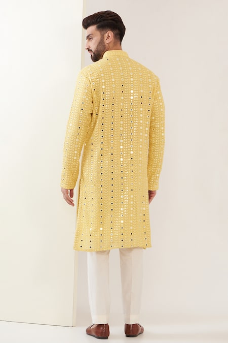 Yellow kurta featuring mirror work embroidery and a mandarin neckline